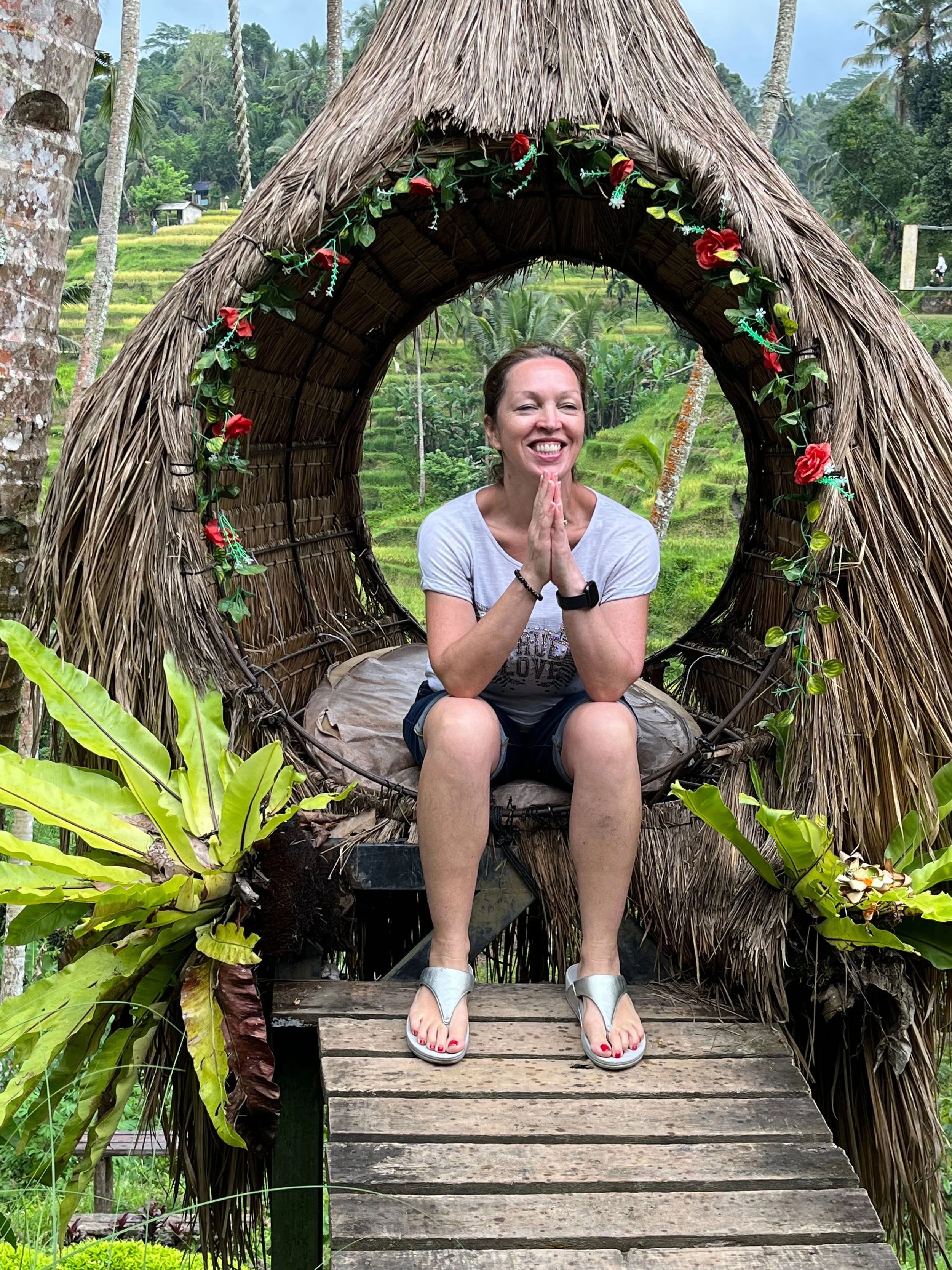 Annie Knowles sitting in a circular wicker and thatch structure decorated with flowers, surrounded by lush greenery and palm trees.